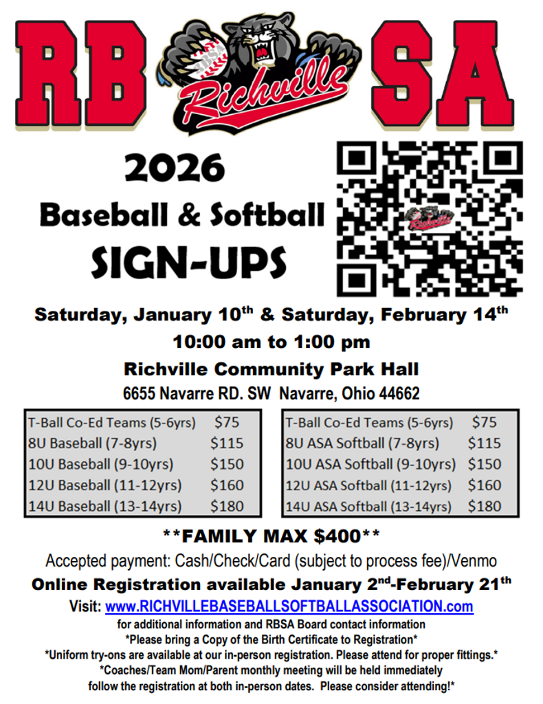 Established in 1963, Richville Baseball and Softball Association is the oldest baseball charter in Stark County. We are a non-profit organization who proudly provides an enriching baseball and softball experience for the youth in our community.